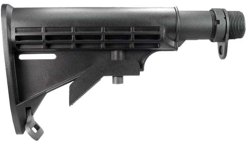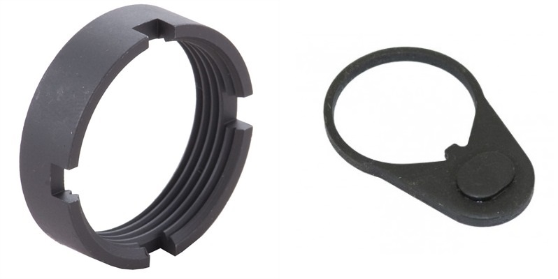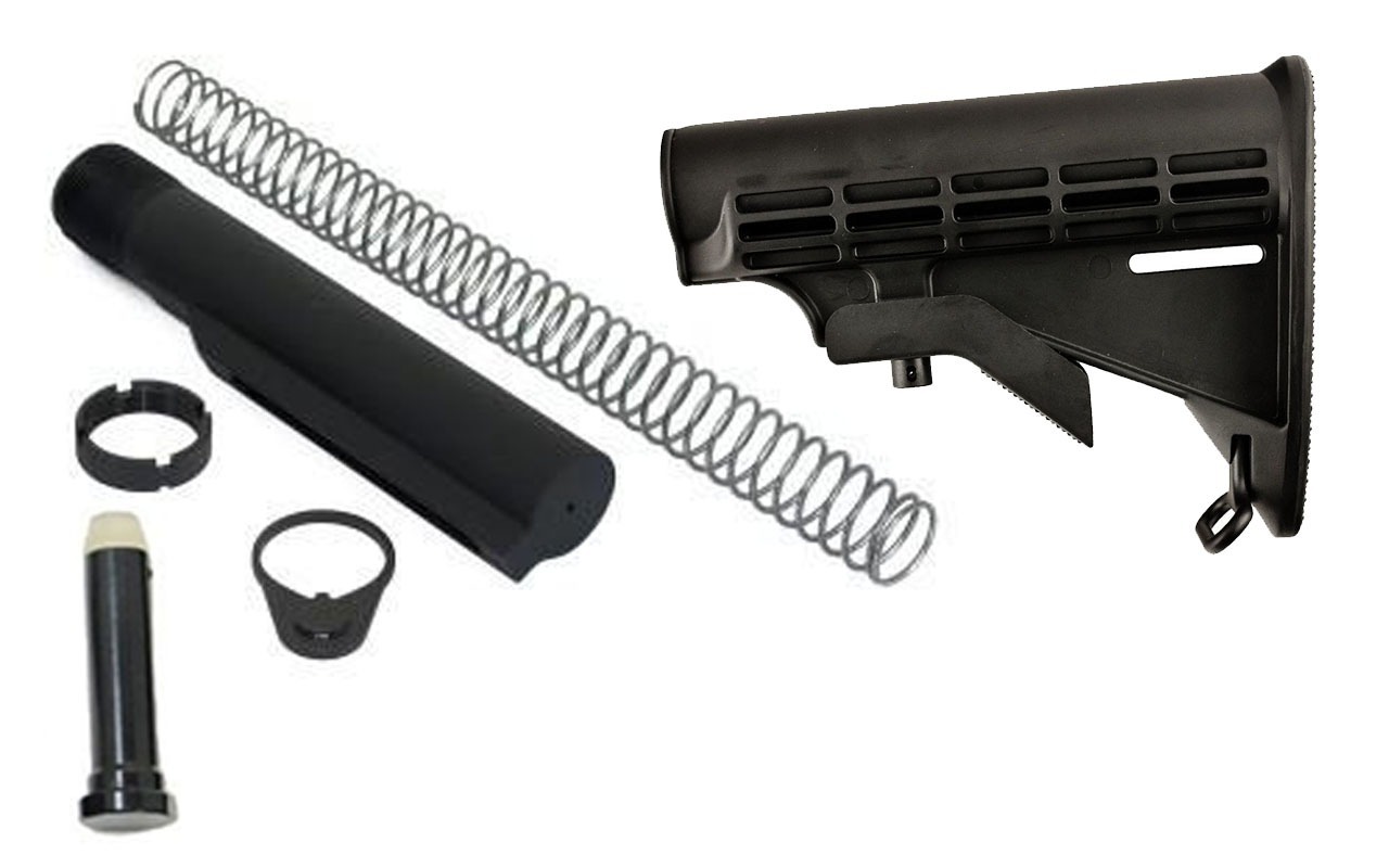 The buffer assembly consists of the recoil spring, weighted buffer, receiver extension (buffer tube), buttstock or pistol brace, latch plate, and the castle nut for tightening the tube to the lower receiver.