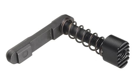 The magazine catch and button work together, allowing you to insert and remove magazines. The notched portion of the catch engages with the magazine inside the lower's magazine well. When the button is depressed from the right side of the receiver, the catch is released and the magazine falls. The pictured spring keeps tension against the catch, preventing the magazine from releasing until the mag button is depressed.