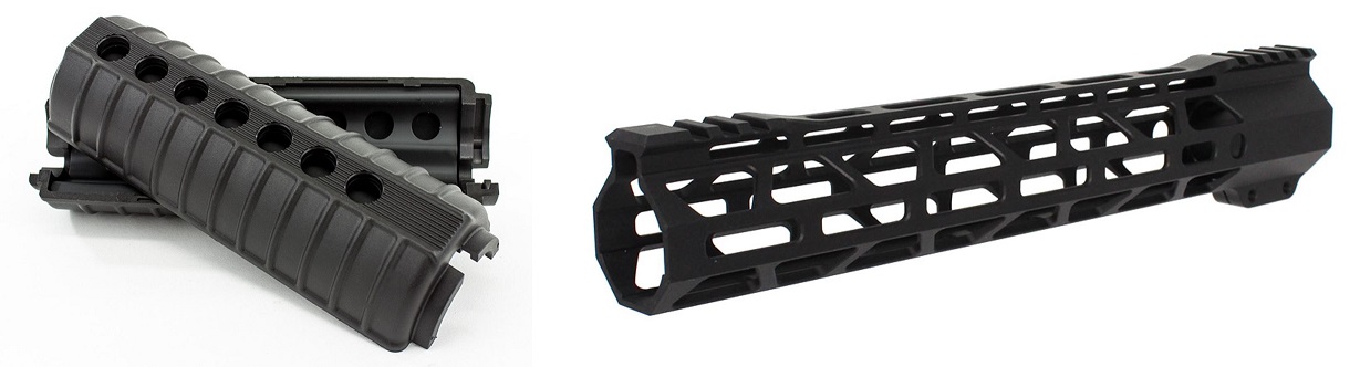 The AR-15's handguard serves two purposes: Protect the gas block and tube from damage, and protect your hand from the heat generated by the barrel when firing. Handguards are configured as two-piece units, like the "old-school" plastic M4-type guard shown left, and one-piece handguards milled from aluminum, shown right.