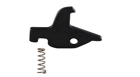 The disconnector sits atop the trigger and attaches to the trigger via the trigger pin. As described above, the disconnector catches the hammer after the bolt rides backwards, holding the hammer down until the sear on the trigger engages the hook on the hammer. The disconnector spring provides the necessary tension for the disconnector to latch onto the hammer via the hammer hook.