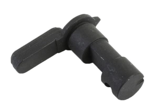 The selector lever, commonly called the “safety”, sits flush against the left side of the lower receiver. When engaged, or "SAFE", the rounded portion of the lever inside the receiver prevents the trigger from being pulled. When disengaged, or set to "FIRE", the lever rotates to expose a flattened portion that allows clearance for the trigger to be pulled. A small detent and spring capture the lever, preventing it from falling out of the receiver.
