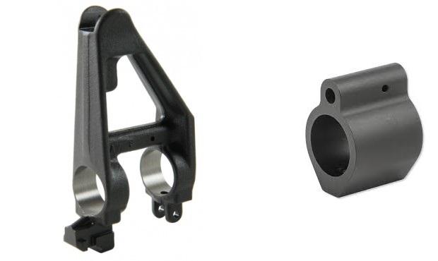 The gas block is fitted directly to the barrel. A small hole drilled in the barrel, called a gas port, allows gas to travel through the block into the tube. Most gas ports have a diameter of 0.063" to 0.089". Gas blocks are commonly found in two configurations, shown above: The classic "A2-style", which combines a front sight post and gas block into one unit (pictured left), and the modern, lightweight low-profile block, pictured right.