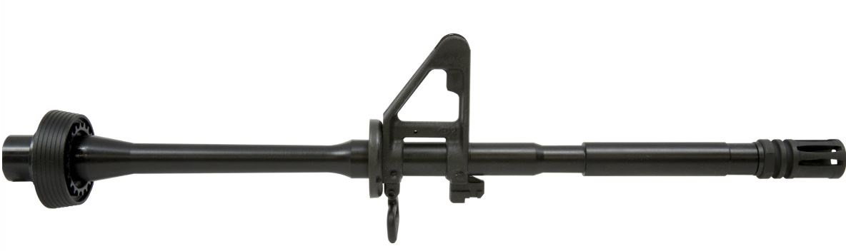 The barrel is responsible for sending rounds downrange. The barrel exampled above is typical for any AR-15 chambered in 5.56 NATO or .223 Remington: It measures 16" in length, it's made from 4150 Chromoly Vanadium steel, and it features a 1:7 twist rate. It's drilled for a carbine-length gas port and it's coated with a Melonite finish.