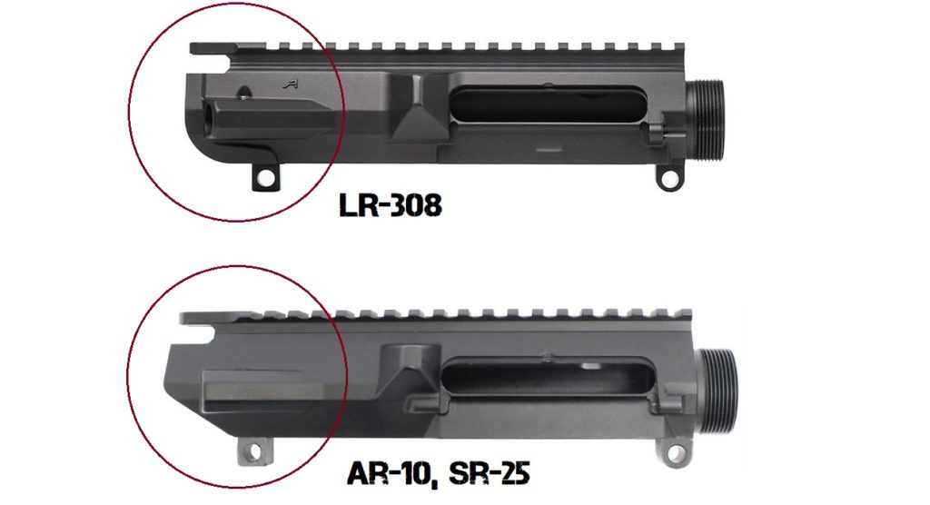 The AR-10 and SR-25 upper and lower receivers are shaped with an acute, relatively straight angle in front of the buffer tube housing and behind the rear takedown pin. The LR-308's upper receiver uses a rounded profile. This prevents an AR-10 and LR-308 lower from being mated together, and vice versa: