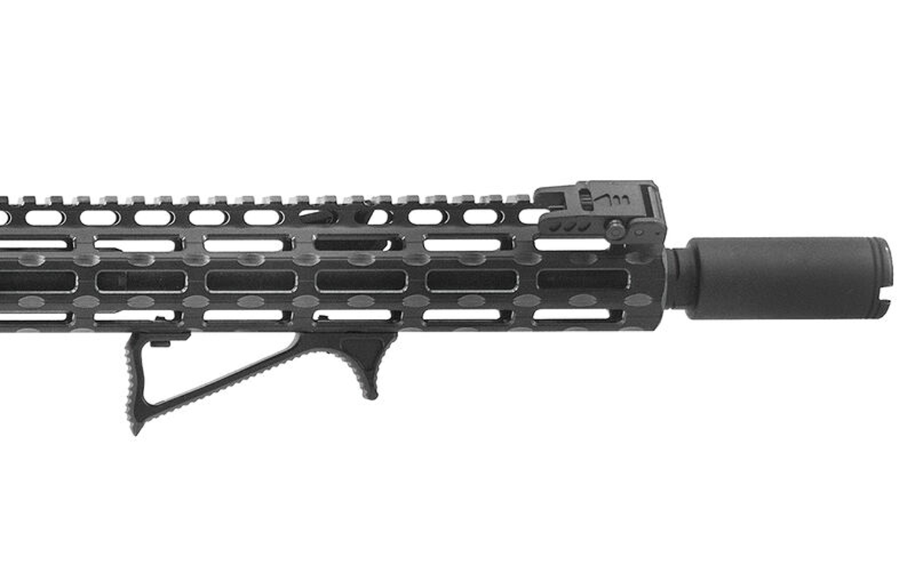 This angled foregrip enhances the look of your AR15 and also allows you to fit the rifle more snuggly into your shoulder which provides more resistance to recoil impulse. The inside of the angled foregrip is serrated and allows for great retention. Improve weapon control for more accurate and faster follow up shoots by positioning the hand high on the centerline of the the bore.