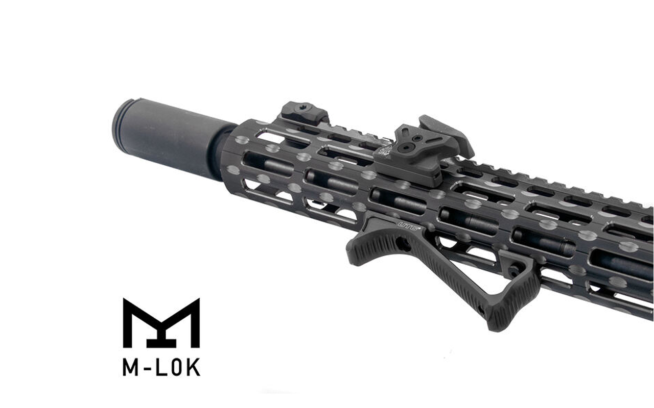 This Ultra Slim Angled MLOK Foregrip from UTG is constructed from 6061-T6 Aluminum and anodized with a matte black finish. It is compatible with M-LOK style rails, shrouds, and hand guards. This angled foregrip provides a very comfortable, forward grip all in a minimal, lightweight package.