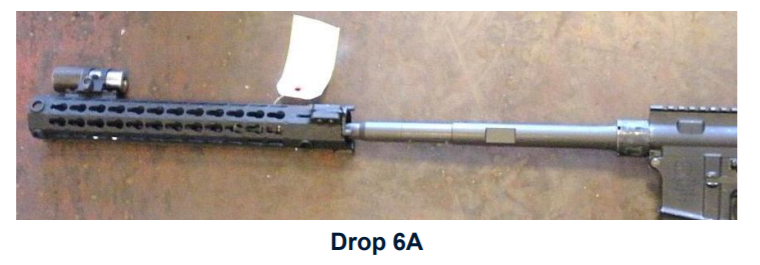 Drop 6 was conducted twice. The first drop caused total separation of the handguard from the barrel nut.