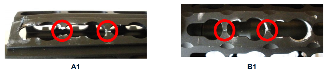 - Drop 5 resulted in a fracture between the holes on the rail slots.