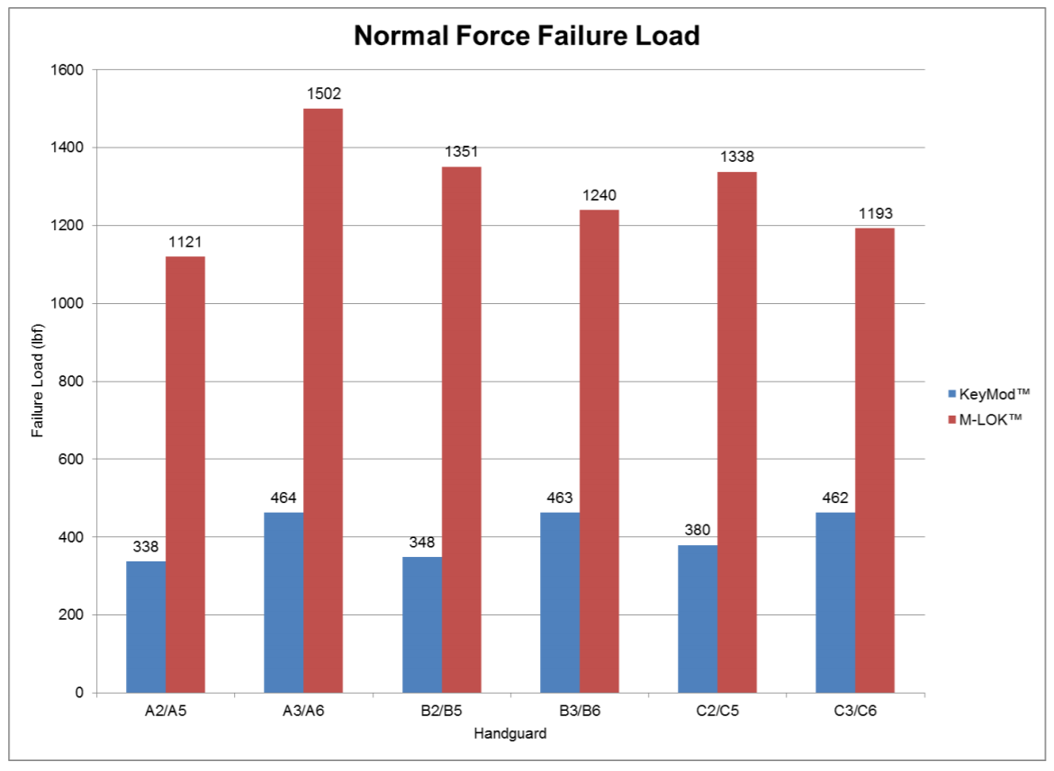 On average, M-LOK was able to withstand approximately 215% more force before failure when compared to KeyMod.