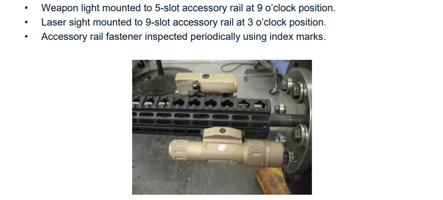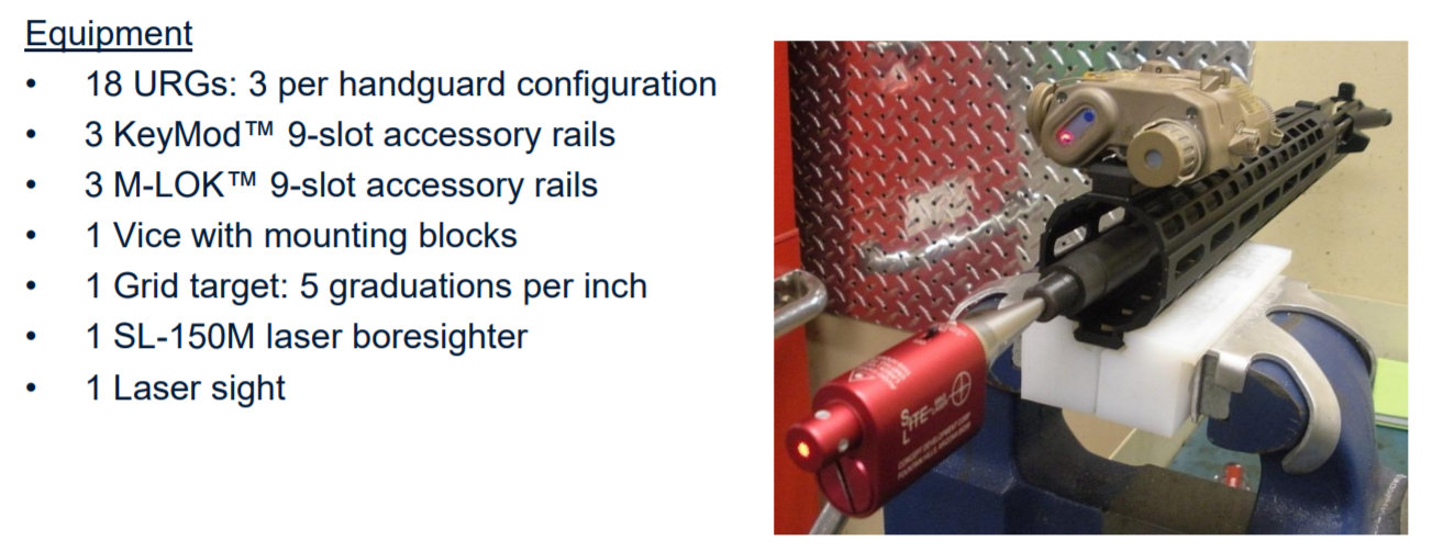 SOCOM first tested repeatability, or how much point of aim remains the same on a laser sight when removed and reattached to the rail systems. They accomplished this by installing a PEQ-15 laser on both rail systems, measuring its point of aim (POA), removing it, and reinstalling it. They then measured how much POA shifted.