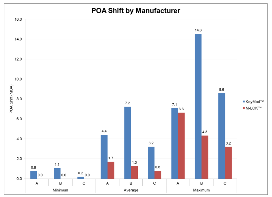 The most telling sign from this graph is the "minimum shift" comparison. KeyMod wasn't able to replicate POA exactly, and shift at least somewhat when reinstalled properly. M-LOK, when properly reinstalled, was able to maintain exact POA with no shift. M-LOK is the clear winner when it comes to removing and reattaching sights or aiming accessories without losing accuracy or having to re-zero your weapon.