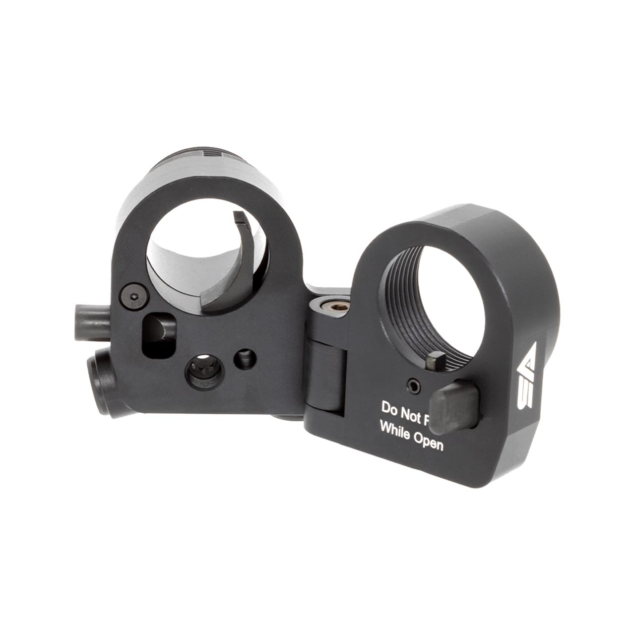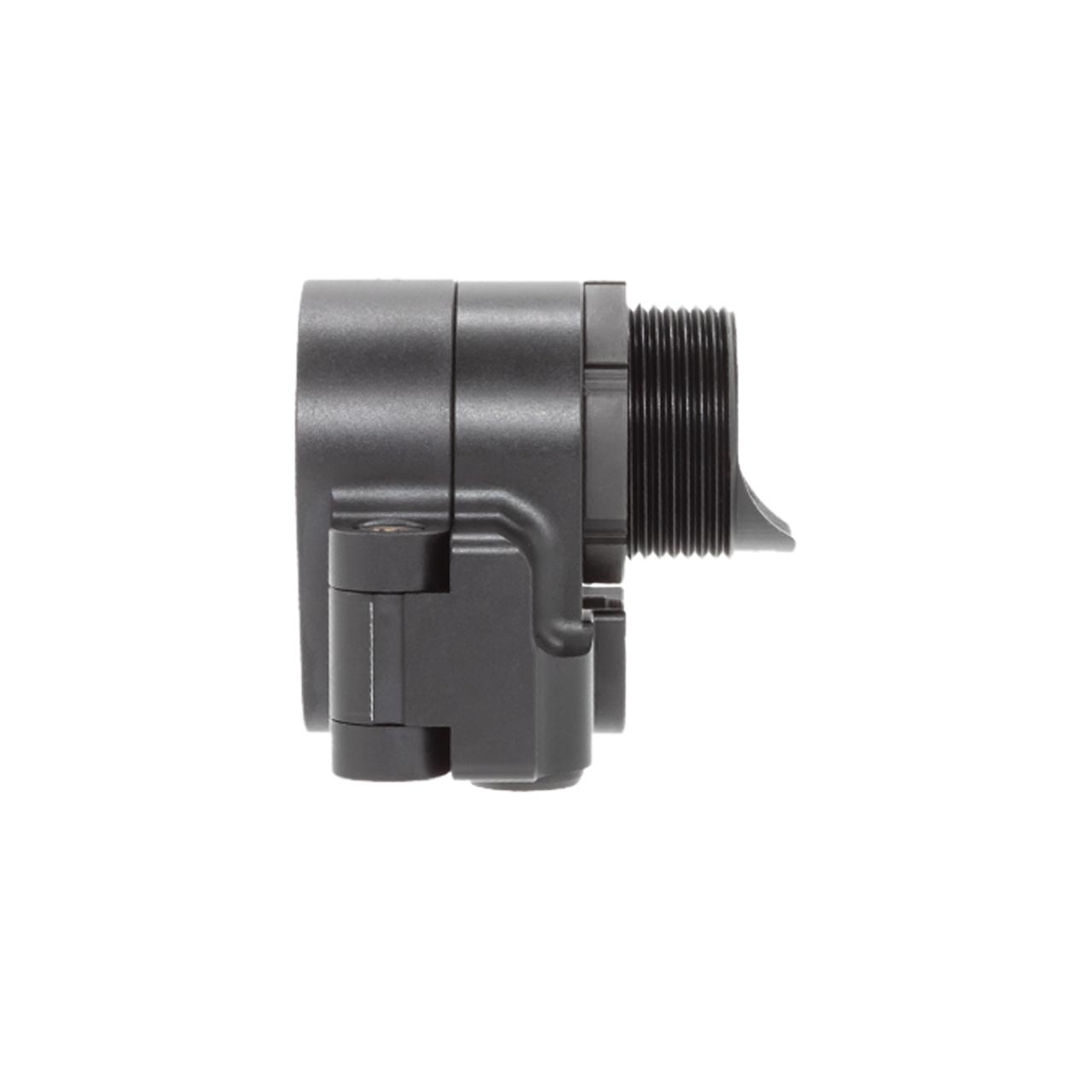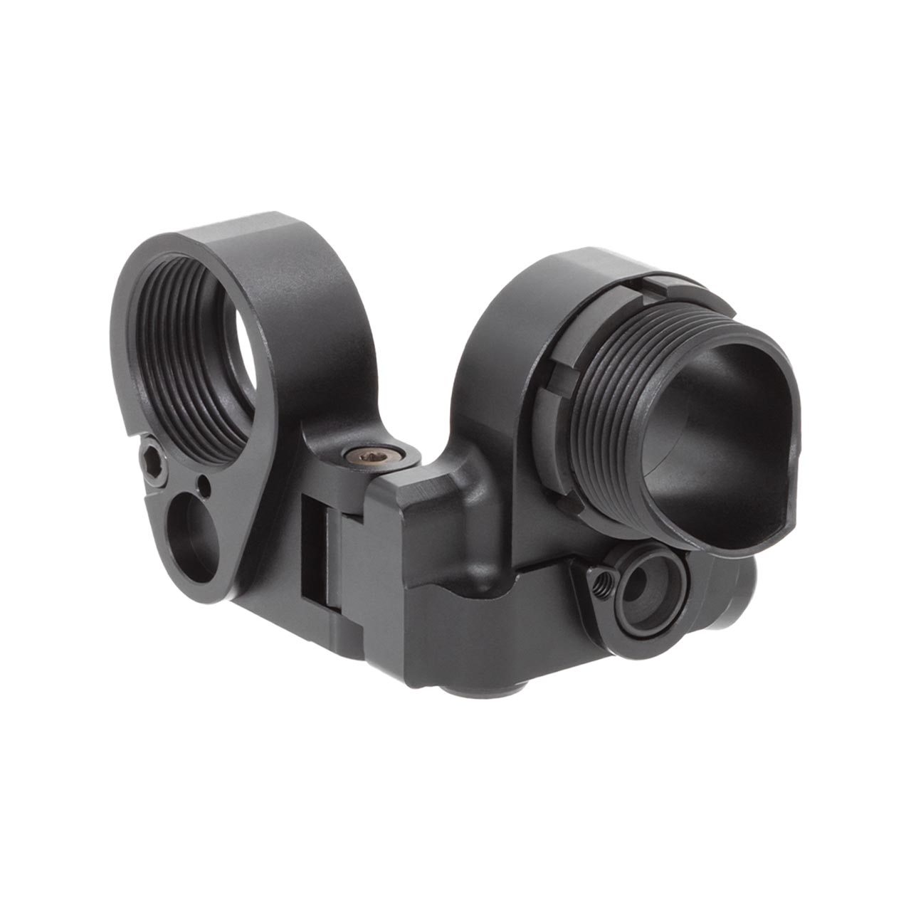 3. Next, open the hinge on the Stock Adapter 90 degrees. Thread your original buffer tube and castle nut onto the Adapter's threaded housing. Continue threading the tube onto the Adapter until the retaining pin inside the adapter is captured by the cut-out in your buffer tube's threads.