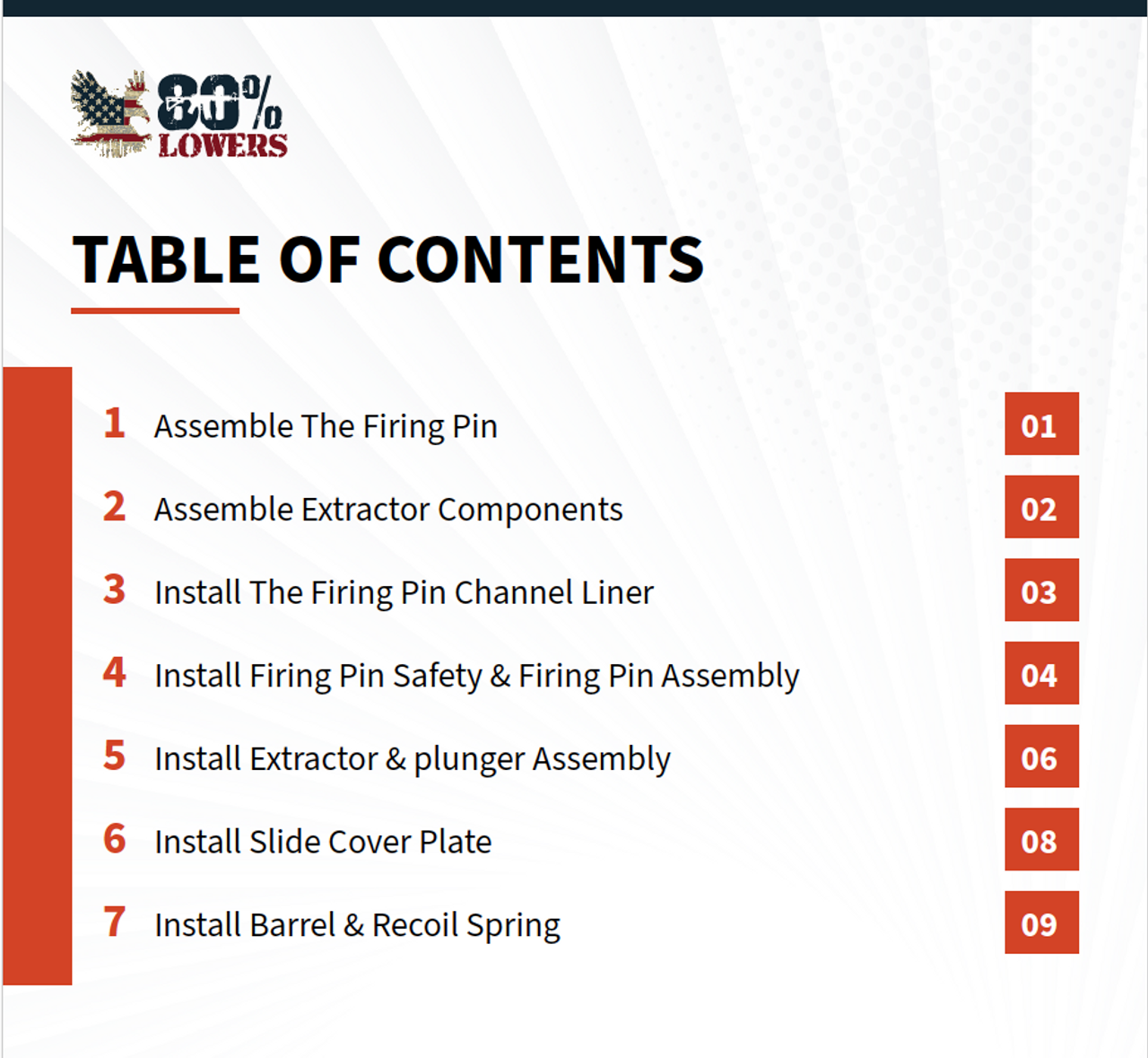 This step-by-step downloadable guide describes how to assmble a glock slide. We’re putting together a GLOCK 19 slide using one of our GLOCK build kits. These instructions are applicable for other slides, too, like the G17 or G43.