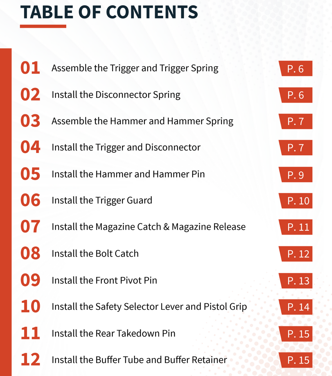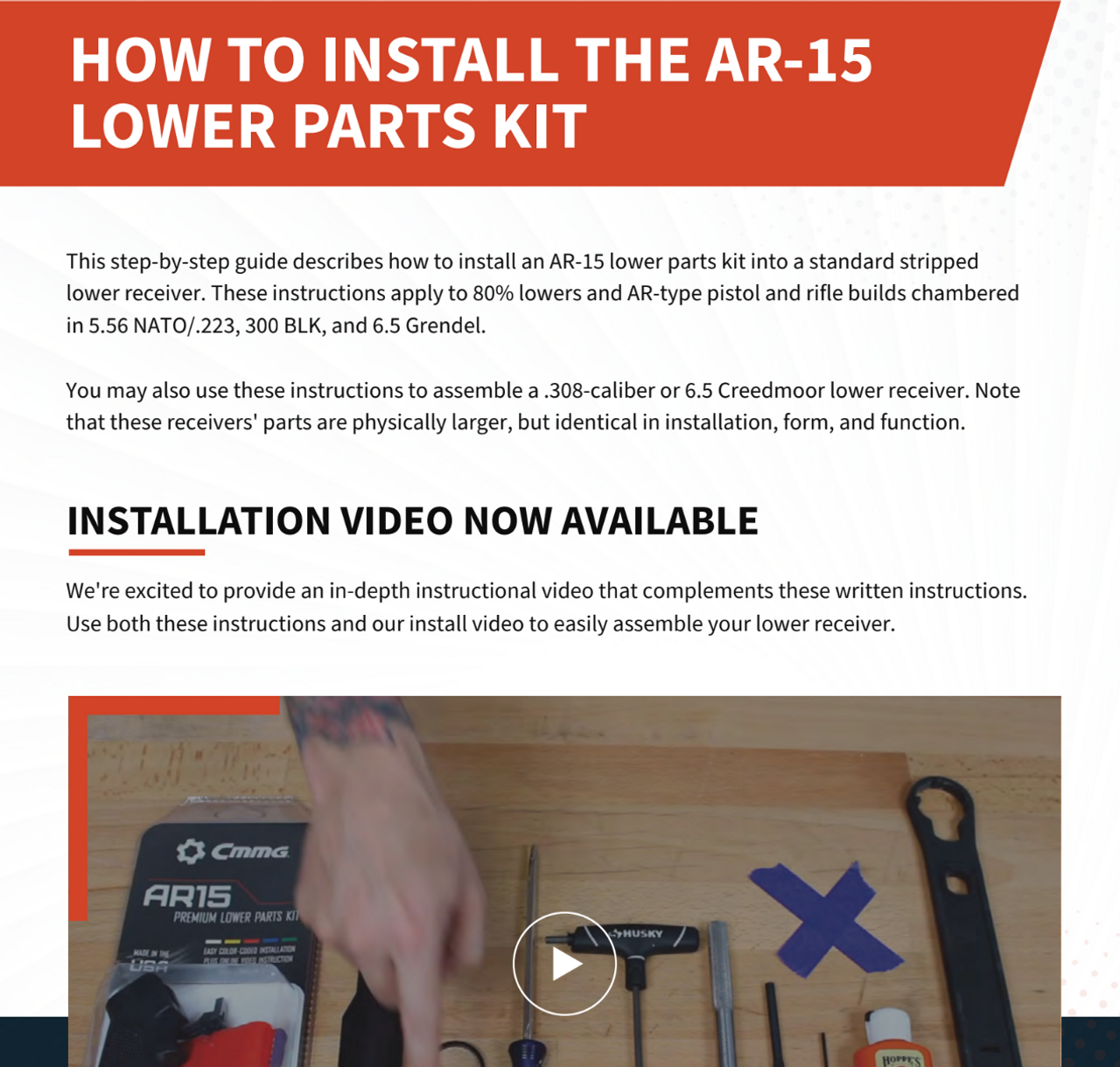 This step-by-step downloadable guide describes how to install an AR-15 lower parts kit into a standard stripped lower receiver. These instructions apply to 80% lowers and AR-type pistol and rifle builds chambered in 5.56 NATO/.223, 300 BLK, and 6.5 Grendel.